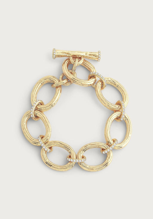The chain bracelet is crafted with heavy 18k gold dipped brass castings which are punctuated and banded with hundreds of dazzling hand set crystals...