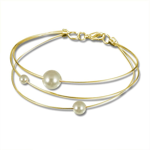 This bracelet is handcrafted of three gold-filled wires each bearing a glass pearl encircling your wrist like planets in orbit. Handmade in the USA...