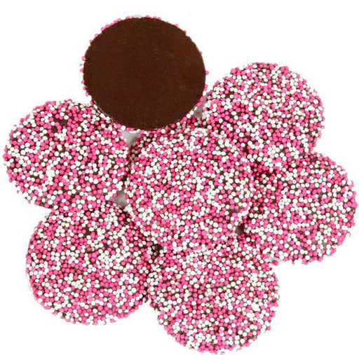 Rich dark chocolate discs coated in crunchy white, pink and red sprinkles on one side. Enjoy them as a treat to satiate your chocolate desire, or u...