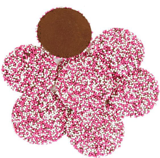 Smooth milk chocolate discs coated in crunchy white, pink and red sprinkles on one side. Enjoy them as a treat to satiate your chocolate desire, or...