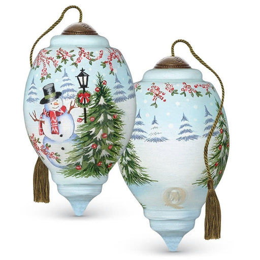 Bundled in a red and white scarf and a classic top hat, a snowman celebrates holiday happiness near a nostalgic street lamp on this Christmas ornam...