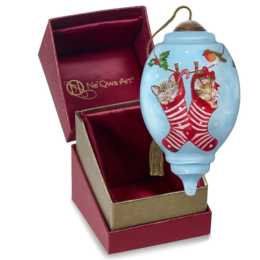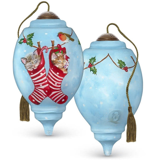 This hand-painted Christmas ornament features two cute kittens sleeping in striped Christmas stockings while a friendly bird perches nearby, inspir...