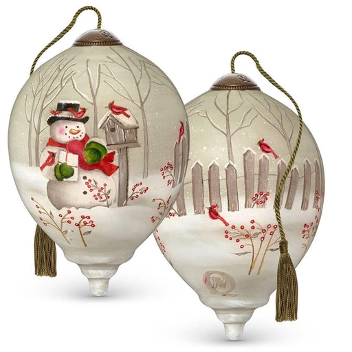 Red cardinals and a smiling snowman with a simply wrapped Christmas gift exchange holiday greetings amidst a pretty winter landscape in a heartwarm...