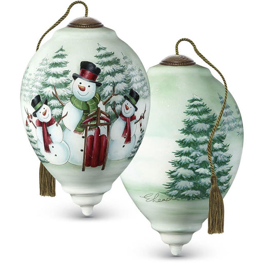 A trio of cheerful snowmen appear ready to hit the hills with their red toboggan. Evergreens, candy canes, and cozy scarves all set the merry scene...
