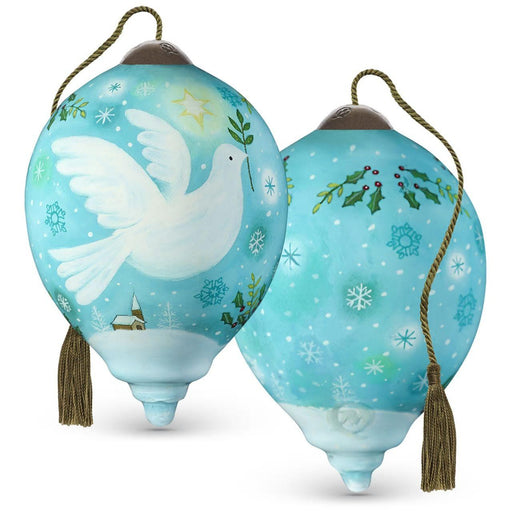 A snow white dove delivers a message of peace to all mankind as intricate snowflakes fall. A vibrant background adds a splash of unexpected color t...