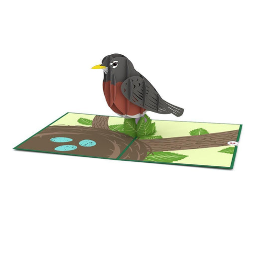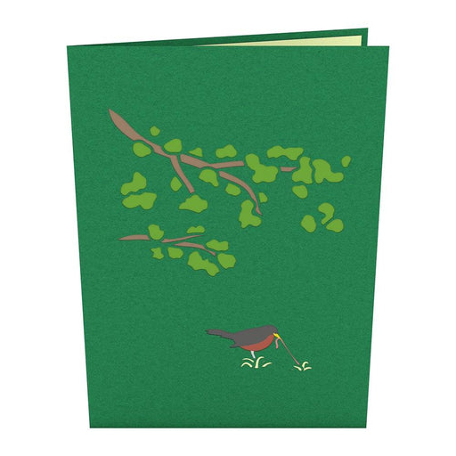 A busy grey and copper robin is laser-cut onto the front of this Kelly green card, tugging at a fresh catch (a wiggly one!) beneath a sprig of vivi...