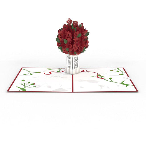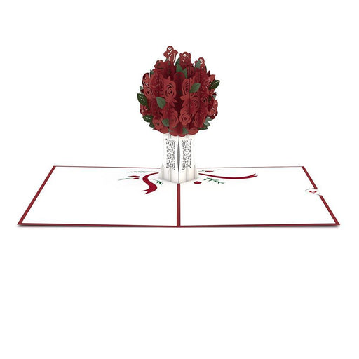 The shimmering cover of this elegant pop up card features a laser-cut red rose bouquet, detailed with delicate white baby's breath flowers. Open th...