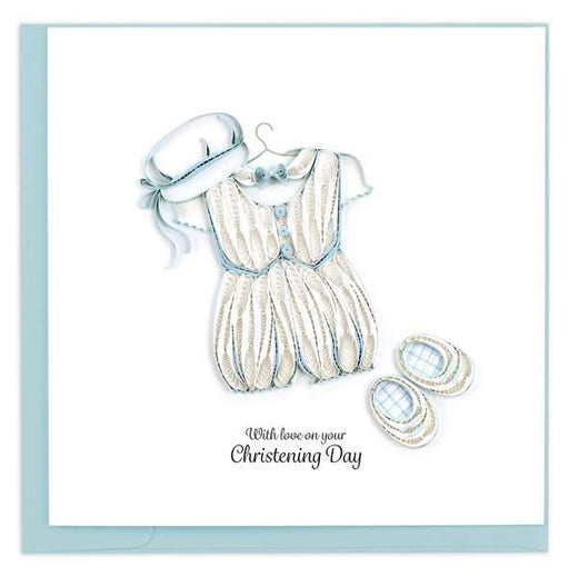 The boy's Christening card is the ideal card to give to a child on his Christening. This card contains a quilled image of an abstract blue and whit...