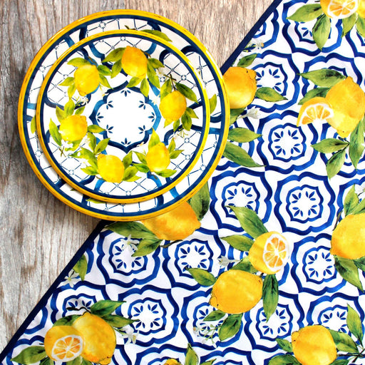 Our Palermo tablcloth is waterproof and stain resistan. A modern mix of Talavera with a fresh burst of lemon that will bring sunshine to your gathe...