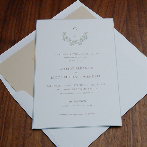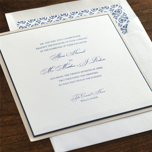 by Designers' Fine Press The Jardines Suite features a modern monogram with in True Blue thermography (raised) printing and cleverly uses an italia...