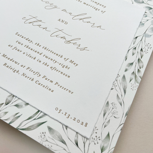 by Designers' Fine Press Botanical greens and gold foil turn the Eloquence Suite into a leafy and warm invitation to a fresh and modern celebration...