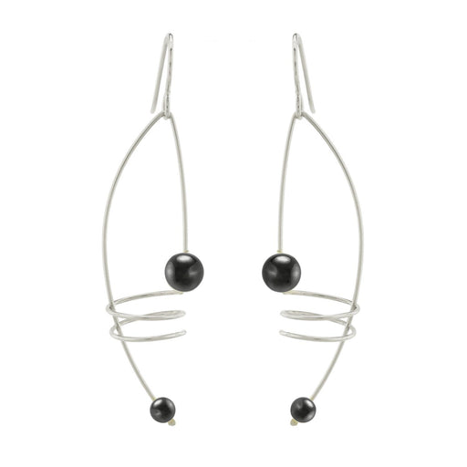 Double drop earrings of Sterling silver wire and hematite beads. Handmade in the USA by artist Sue Rosengard.