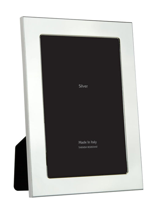 A wide bezeled silverplated picture frame in a smooth tarnish resistant finish. Fits 8x10 photos of both horizontal and vertical orientation. Blac...