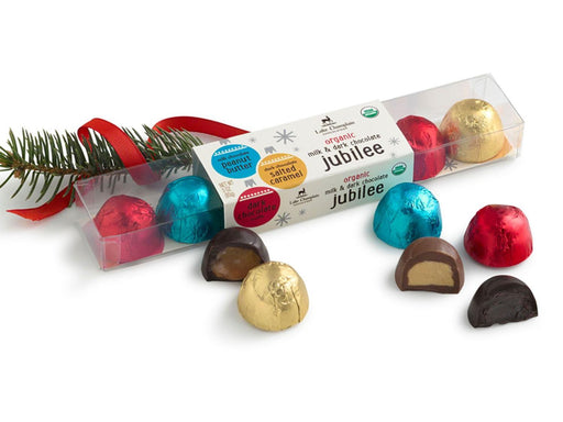 Organic Chocolate Bonbons Christmas Jubilees are here, and that means it’s time to celebrate! This festive, ready-to-give assortment of filled choc...