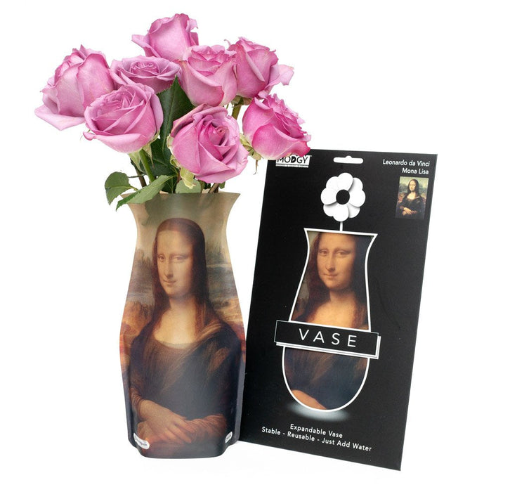 Modgy Expandable flower vases do everything a glass vase does except collect dust, chip or break. These BPA free plastic vases are durable and stable enough to hold a flower bouquet and are ideal for events, weddings, and any table top. Modgy vases are collapsible and economical, making it easy to keep a variety of colors and patterns tucked away for any occasion. To clean, rinse with water and dish soap. Leave open to dry, store flat. This vase features Mona Lisa by Leonardo Da Vinci.