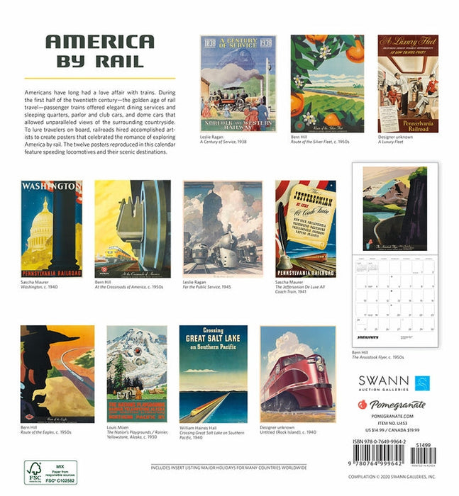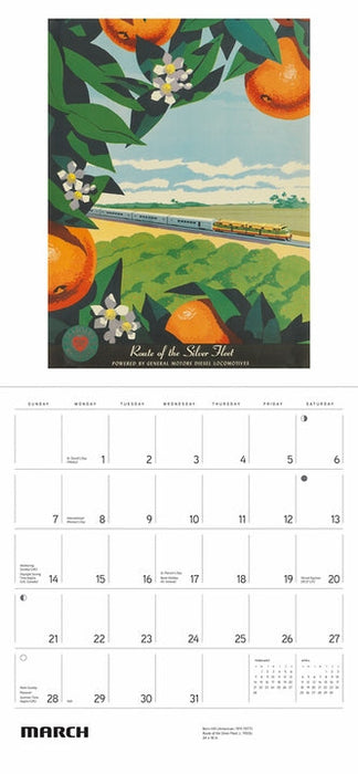 Americans have long had a love affair with trains. During the first half of the twentieth century—the golden age of rail travel—passenger trains offered elegant dining services and sleeping quarters, parlor and club cars, and dome cars that allowed unparalleled views of the surrounding countryside. To lure travelers on board, railroads hired accomplished artists to create posters that celebrated the romance of exploring America by rail. The twelve posters reproduced in this calendar feature speeding locomotives and their scenic destinations. Size: 12 x 26 inches, open.