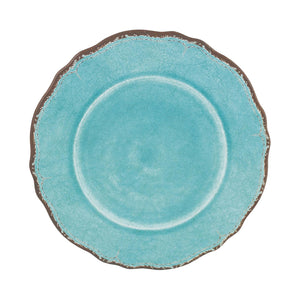 Rimmed with the color of natural clay and lightly textured, our Antiqua Turquoise dinner plate captures the look and beauty of antique stoneware. With its exceptional weight and luxurious textured surface treatment it has the appearance of real ceramic. These timeless pieces are perfect for both casual gatherings and formal occasions.