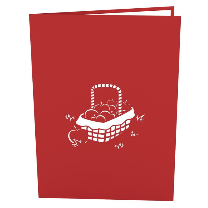 3D Apple Tree Pop Up Greeting Card. 5" x 7". Comes with envelope. The vibrant red cover of this unique apple tree card features an illustration of a wicker basket filled with ripe red apples. These delicious treats are a teaser for a sweet surprise inside the card.