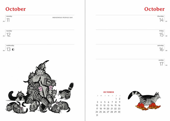 A world of absurd adventures awaits B. Kliban’s main feline, a tabby named Cat. His adventures playing ukulele, painting with watercolors, or frolicking in the clouds is the stuff that real cats can only dream about. (We’d bet they could relate to radiator naps, though.) Kliban used a cast of feline characters to express his whimsical sense of humor. For decades, his sometimes realistic, often surreal portrayals of the striped felines have delighted legions of fans. With the twelve watercolors and many cartoons in this engagement calendar, we’re sure you’ll agree that Kliban’s Cat can make any situation fresh, playful, and fun. Size: 6 x 8¼ inches.