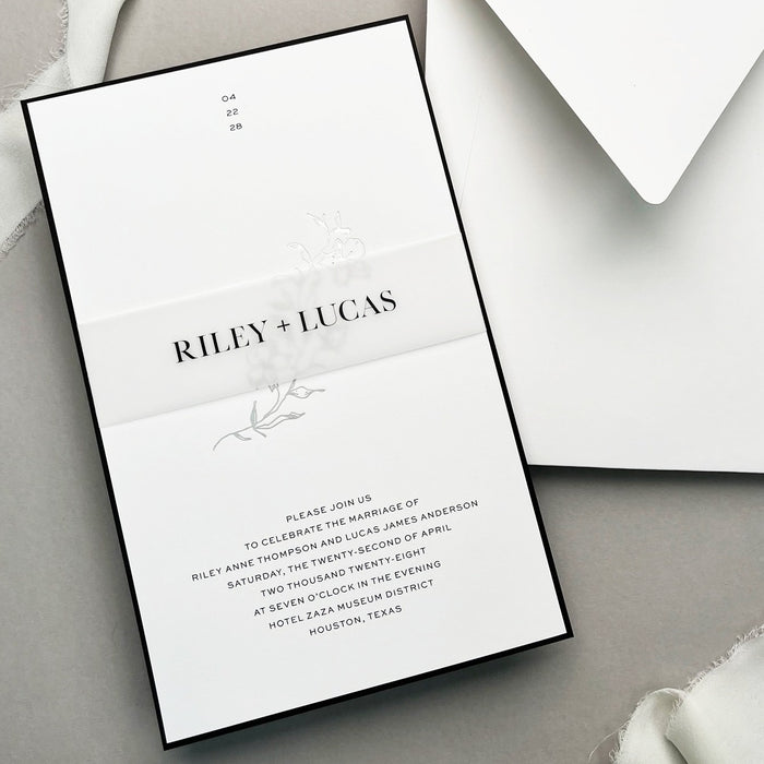 Invitation: Black Thermography Ink with Matte Silver Foil Stamping floral motif on Card with Black Digital Ink on Vellum Band.