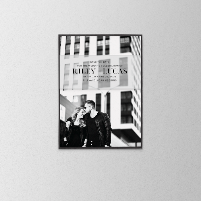 Save the Date: Digital Photo Printing background with Black Digital Ink on Vellum Band.