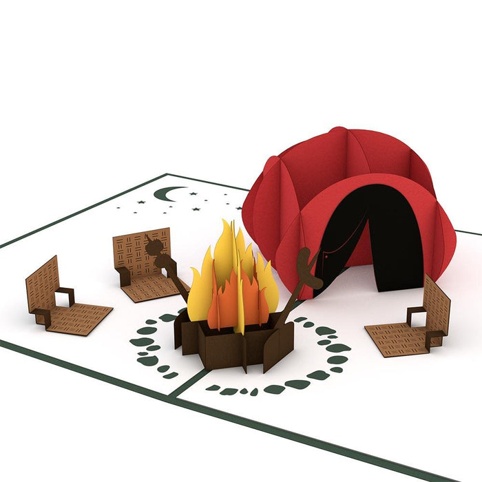 The front of this hunter green pop-up card showcases a crackling laser-cut campfire surrounded by stones. Once opened the Camping Trip pop up card displays an incredible sight: a three-dimensional camping scene pops up to delight the recipient.