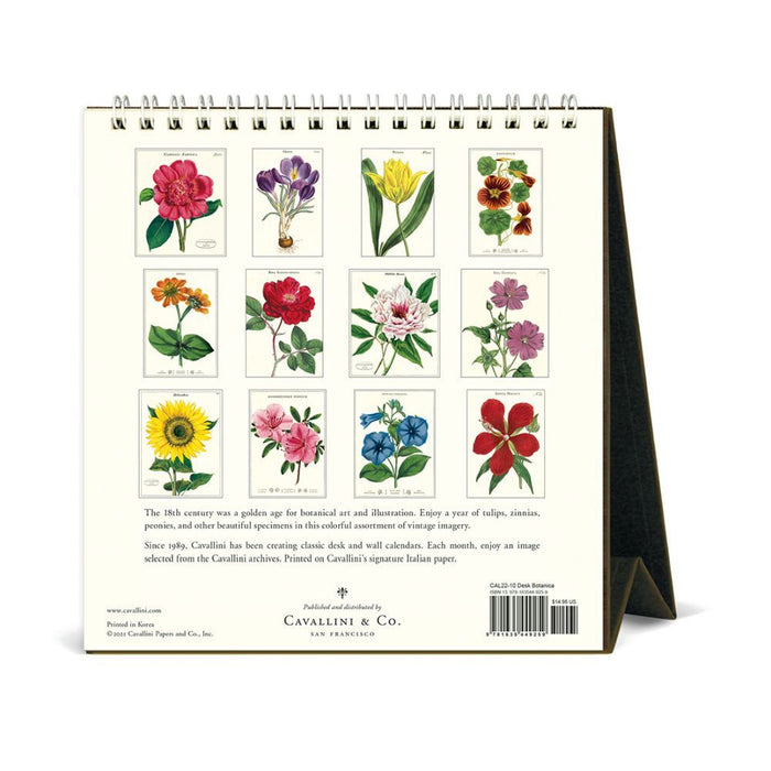 This small 6" x 6" 1/2" desk calendar from Cavallini features colorful and vintage-inspired images of botanica with their flower names. Printed on archival-quality Italian paper, the pages are spiral bound at the top. The base opens to 3" wide to provide a sturdy easel atop your tabletop or desk.