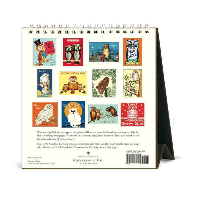 This small 6" x 6" 1/2" desk calendar from Cavallini features colorful and vintage-inspired images of owls with their designated names. Printed on archival-quality Italian paper, the pages are spiral bound at the top. The base opens to 3" wide to provide a sturdy easel atop your tabletop or desk.