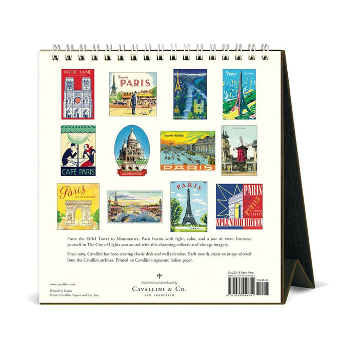This small 6" x 6" 1/2" desk calendar from Cavallini features colorful and vintage-inspired images of Paris, France. Printed on archival-quality Italian paper, the pages are spiral bound at the top. The base opens to 3" wide to provide a sturdy easel atop your tabletop or desk.
