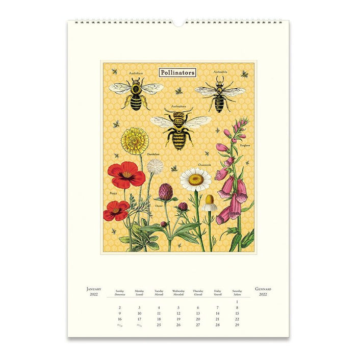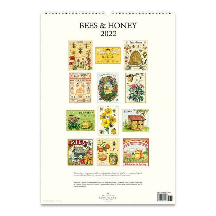 This large 13" x 19" wall calendar features colorful vintage-inspired images of of bees, honey, and everything else a bee could love. Printed on archival-quality Italian paper, the pages are suitable for framing and spiral bound with a small loop on top fit for a hook.