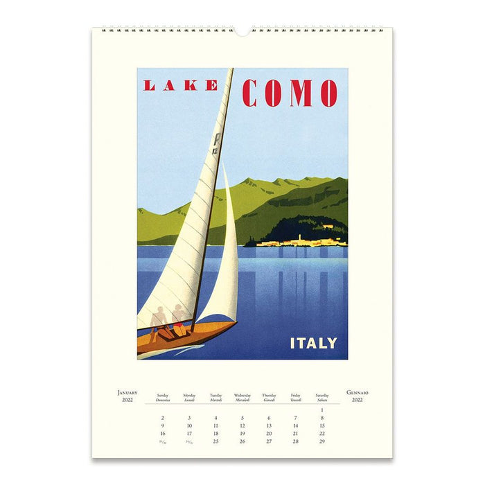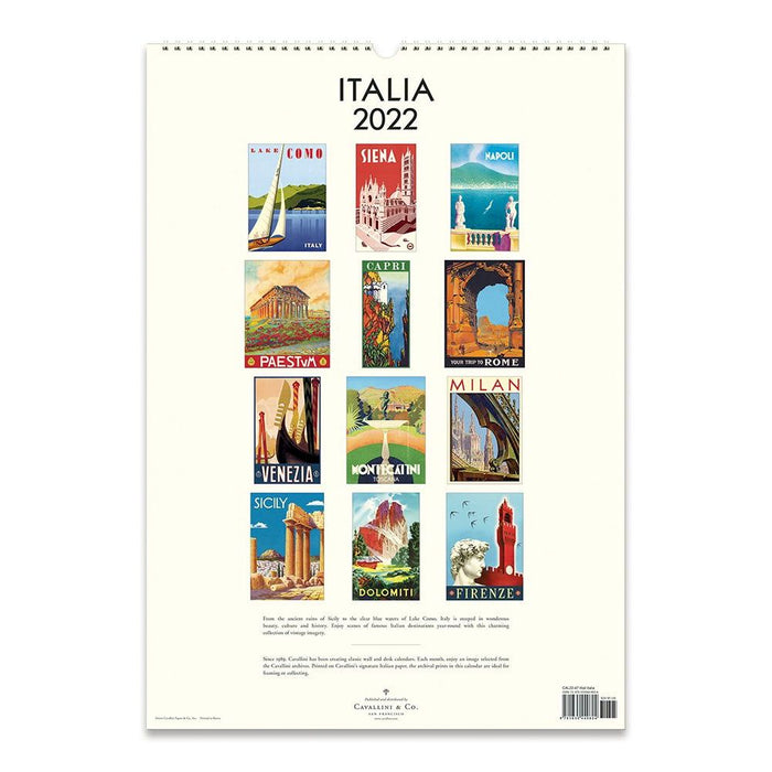 This large 13" x 19" wall calendar features colorful vintage-inspired images of Italian destination posters. Printed on archival-quality Italian paper, the pages are suitable for framing and spiral bound with a small loop on top fit for a hook.