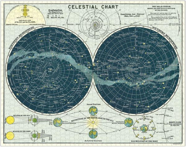 This beautiful 1000 piece jigsaw puzzle features Cavallini’s vintage Celestial Chart. The puzzle is packaged in a 10 inch long cardboard tube, with puzzle pieces safely stored in a muslin bag inside. Finished puzzle measures 22 by 28 inches.