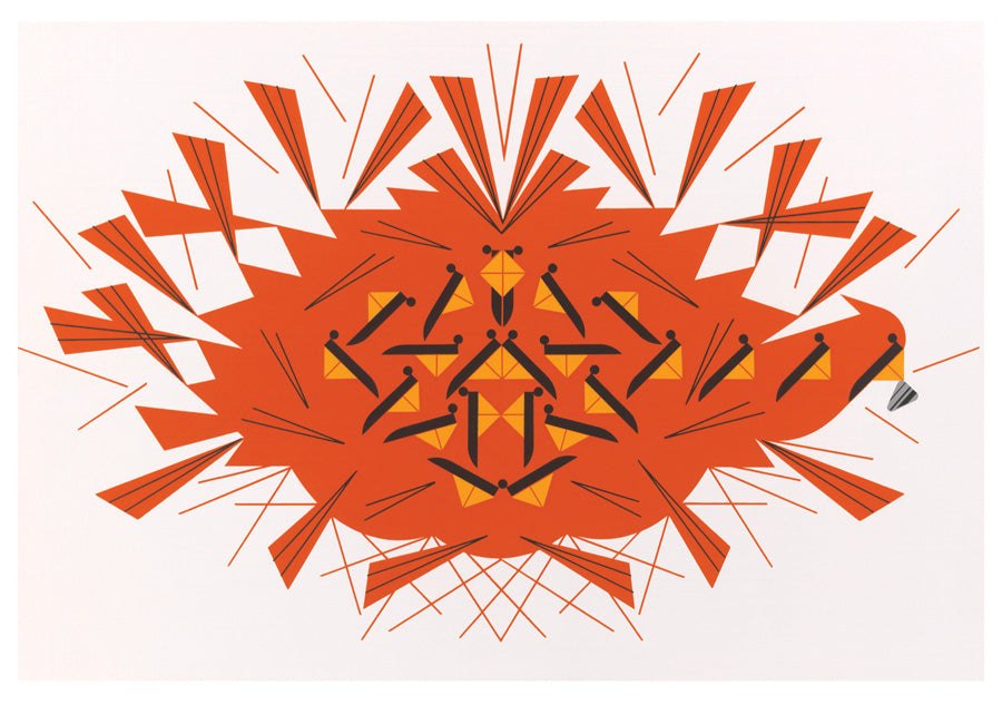 20 blank notecards (5 each of 4 designs) with envelopes in a decorative box and printed on recycled paper. The cardinal was one of Charley Harper’s favorite subjects, and his iconic depictions of the bright red bird are among his most popular images. Describing his method of depicting wildlife, which winnowed out all but the most important details, Harper once said, “I see exciting shapes, color combinations, patterns, textures, fascinating behavior and endless possibilities for making interesting pictures. I regard the picture as an ecosystem in which all the elements are interrelated, interdependent, perfectly balanced . . . and herein lies the lure of painting; in a world of chaos, the picture is one small rectangle in which the artist can create an ordered universe.” Enjoy the universe of Harper’s irresistible cardinal in this cheery assortment.