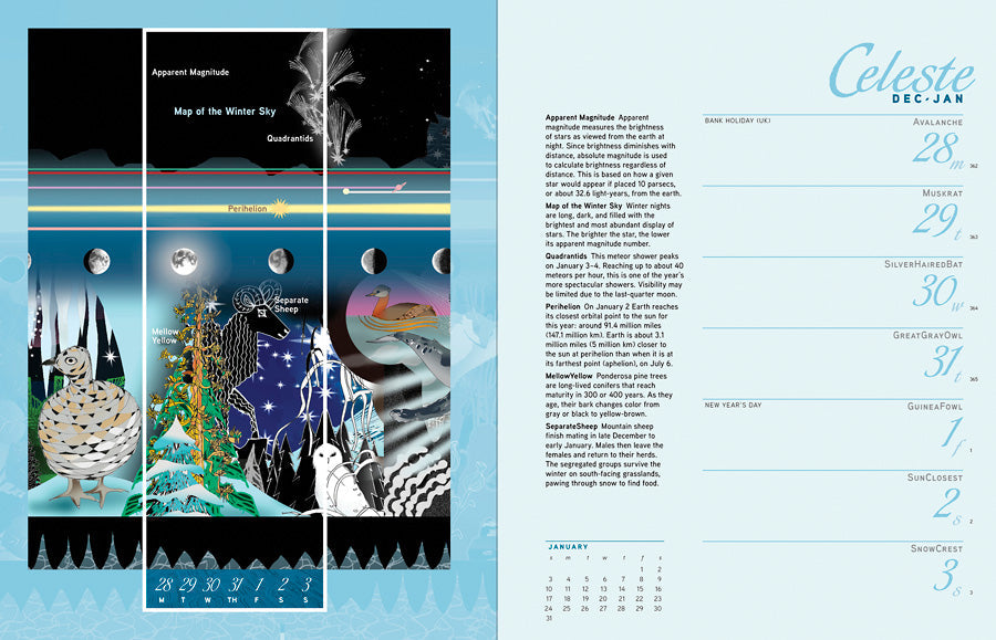 This revolutionary engagement calendar presents information on seasonally visible stars, moon phases and tides, ratios of darkness and light, seasonal behaviors of earth’s creatures, and a host of other details about the natural world. Four foldout panels show each season in full, enhancing your connection with the year’s natural progress. The familiar Gregorian days, dates, weeks, and months, as well as international holidays and a world time-zone map, are also included in this highly functional calendar. But don’t be surprised if you begin thinking differently about time and our place in it! Size: 7 x 9 inches.