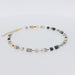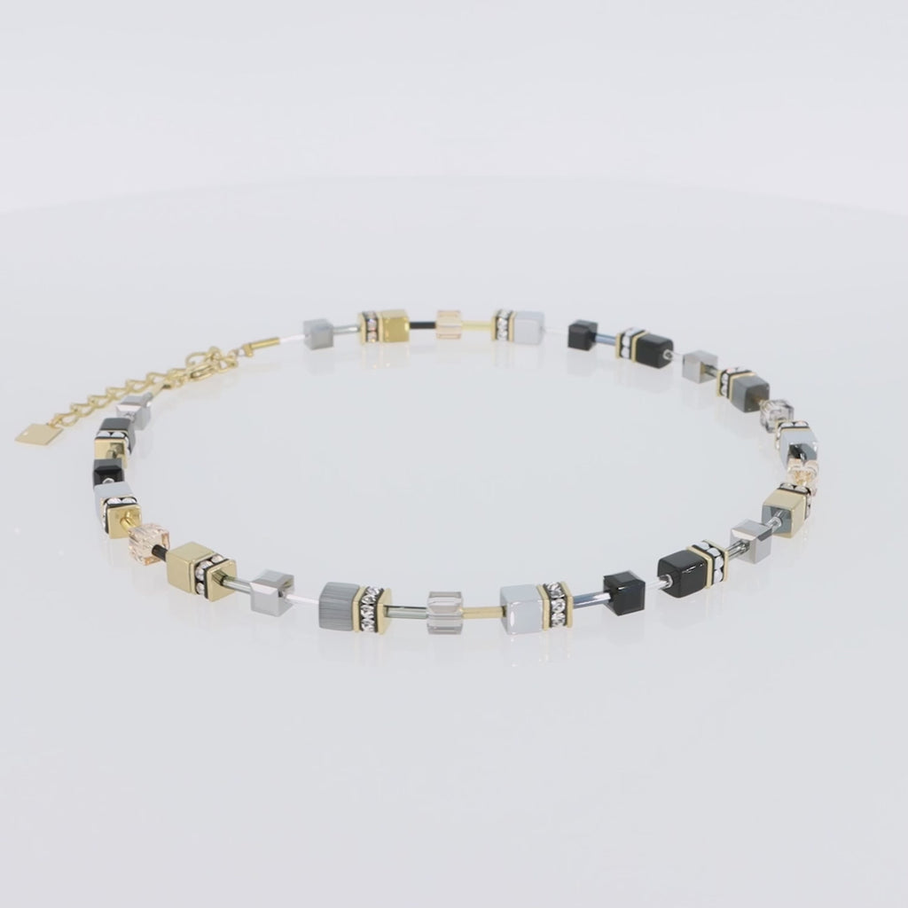 18" adjustable necklace made of Cat-Eye, Hematite cubes with a titanium oxide finish, Swarovski cubes enhanced by steel plates, plated with 24-karat gold, and exclusive Swarovski crystal squares rondels, alternating with glass tubes filled with silver.
