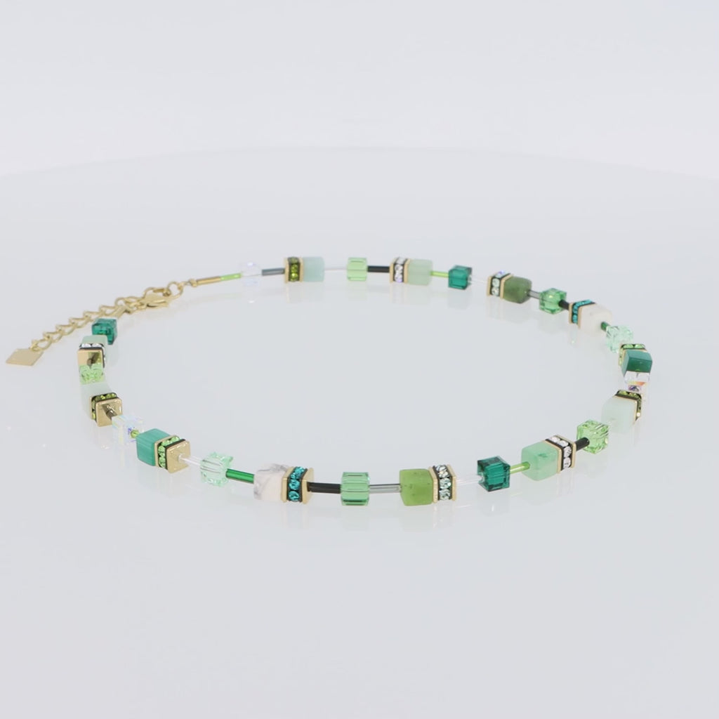 Let them be green with envy at this special edition Geocube Necklace with green aventurine, amazonite, howlite, nephrite jade and Emerald and Light Green Swarovski Crystals. Natural stones and the highest quality European Crystals interplay here for a stunning addition to your jewelry box.