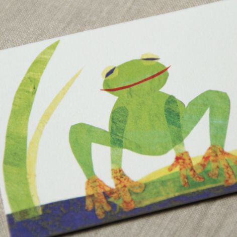 Evoking an effortlessly playful nature, this charismatic stationery will deliver an amiable message to loved ones (especially notes written by tiny hands to grandma and grandpa). The big smile is the first thing you notice on the colorful collage style frog sitting comfortably on these folded notes. So cute, your kids will love to send out hello and thank you notes.