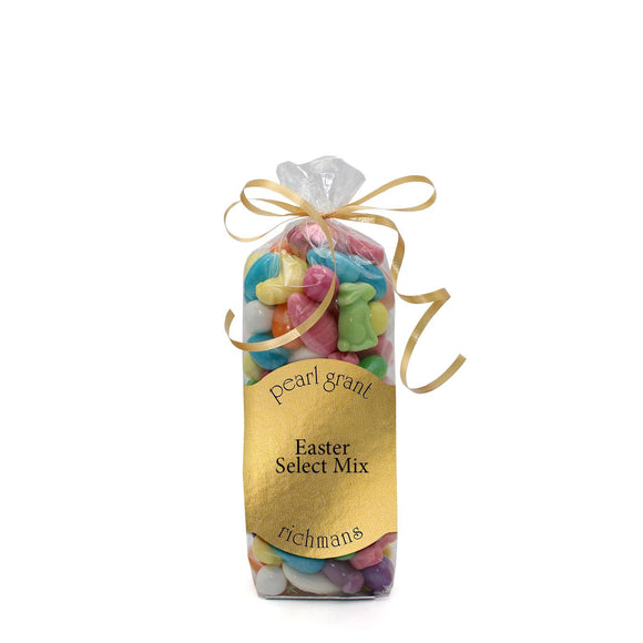 A spring mix consisting of: Easter Cream Chicks & Bunnies in the shapes of various chicks, bunnies, eggs and chicken in a basket, Milk Chocolate Foil Eggs, Holland Mints (NAC) and Easter Jelly Eggs.