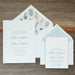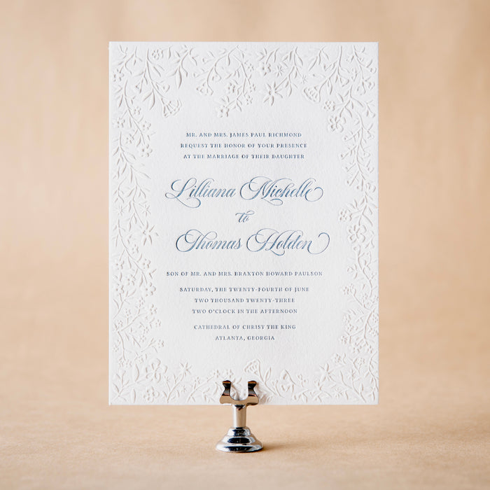 Invitation: Chambray Letterpress Ink with Blind Embossed floral pattern.