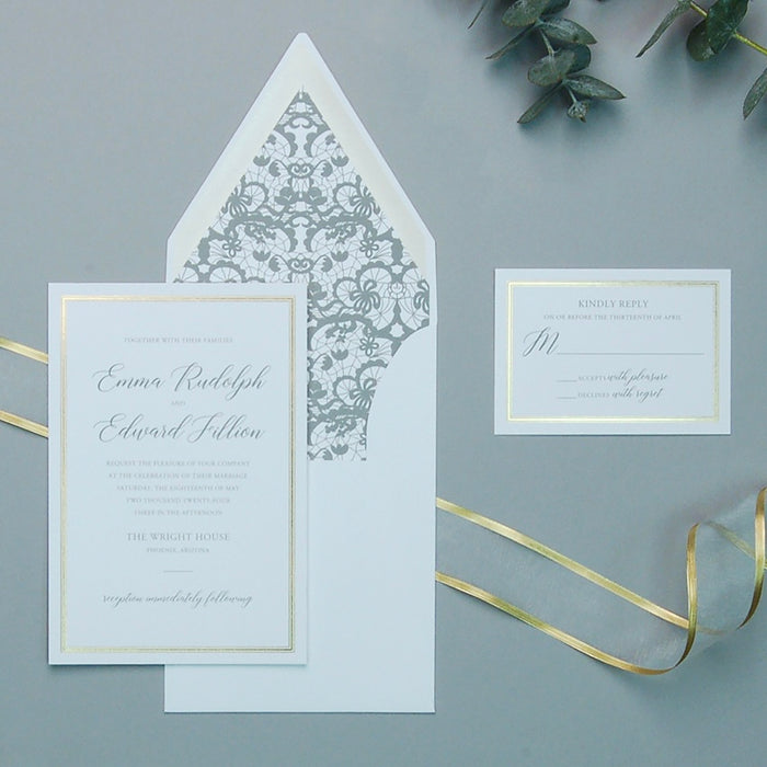 Estate uses a classic gold foil frame with an expressive script for the names. The French flap envelope opens on the vertical end and has a richly textured lining.