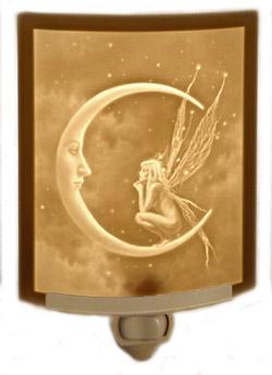 This handcrafted "lithophane"; a thin translucent porcelain night light, is made using a lost art from the 1800's. When lit from behind, the light shining through the different thicknesses of the carving causes a highly detailed image to appear in front, almost magically. This beautiful Fairy is from an original image by David Delamare. they make a number of lithophanes with his Fairies and Mermaids. The subtle beauty of his work, the shading, the composition, everything about his art makes them so perfect for their pieces. Dimensions: 5.5" H. x 3.5" W x 2.25" D. 120V 7W incandescent bulb.