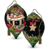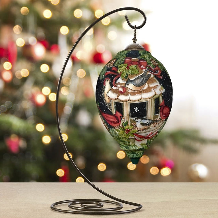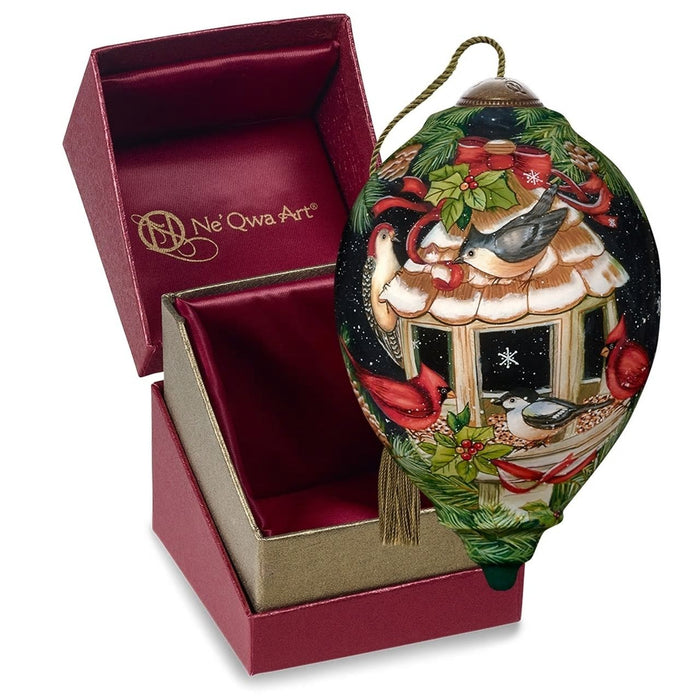 Add a cheerful flair to your Christmas décor with an ornament displaying a festive scene of plump cardinals and other feathered friends enjoying a feast of natural treats in a birdhouse decorated for the holidays. Artwork inspired by original artist Susan Winget is reproduced by Ne’Qwa Art® with the centuries-old technique of hand-painting in reverse on the inside of blown glass. Makes a perfect gift for people who love classic Christmas traditions and cardinal holiday décor. Packaged in an elegant foil-stamped, satin-lined gift box with a Certificate of Authenticity. Meticulously crafted in blown glass and expertly hand-painted. Adjustable tasseled cord included for display on Christmas trees or ornament stands.