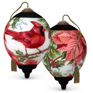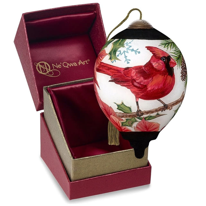 A plump red cardinal perched amidst evergreen branches, pinecones, and red poinsettia flowers adorns this cheerful Christmas ornament with a bright note of natural beauty for your Christmas décor. Artwork inspired by original artist Bradley Clark is reproduced by Ne’Qwa Art® with the centuries-old technique of hand-painting in reverse on the inside of blown glass. Makes a perfect gift for people who love classic Christmas traditions and cardinal holiday décor. Packaged in an elegant foil-stamped, satin-lined gift box with a Certificate of Authenticity. Meticulously crafted in blown glass and expertly hand-painted. Adjustable tasseled cord included for display on Christmas trees or ornament stands.