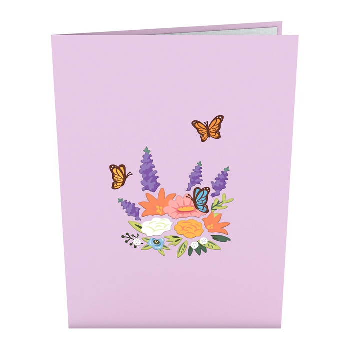 The front of this pale purple cover features a laser cut arrangement of colorful, blooming flowers, accompanied by blue and orange butterflies. Upon opening this beautiful card, a basket appears full of luscious vibrant flowers and greenery. The wicker basket sits on top of a white doily, used to decorate the pale blue tabletop. A few butterfly friends rest on top of the floral arrangement, taking a quick pause before fluttering away.