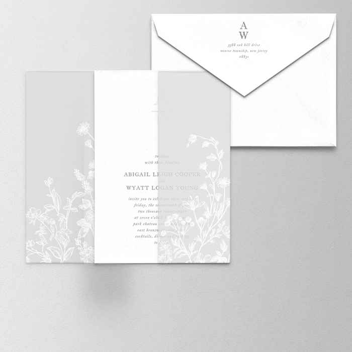 Invitation: Smoke Letterpress Ink with Inkless Monogram for blind deboss appearance. Digital White Ink floral motif on Vellum Wrap.
