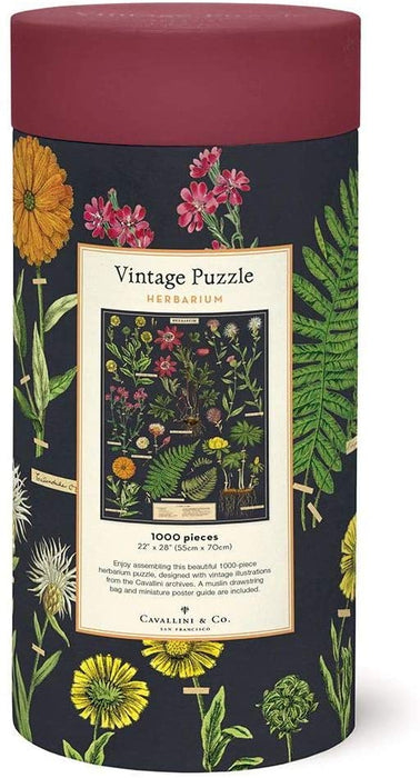 Cavallini's Herbarium puzzle is reminiscent of a vintage botanical chart. This puzzle has images of specimens that have been collected and taped in place. Complete with handwritten scientific names and an instructional block at the bottom. All puzzles are packaged in a 10 inch long cardboard tube with puzzle pieces safely stored in a muslin bag inside. Finished puzzle measures 22 by 28 inches.