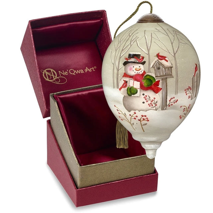 Red cardinals and a smiling snowman with a simply wrapped Christmas gift exchange holiday greetings amidst a pretty winter landscape in a heartwarming scene of friendship on this festive Christmas ornament. Artwork inspired by original artist Emma Leach is reproduced by Ne’Qwa Art® with the centuries-old technique of hand-painting in reverse on the inside of blown glass. Makes a perfect gift for family and friends who are like family. Packaged in an elegant foil-stamped, satin-lined gift box with a Certificate of Authenticity. Meticulously crafted in blown glass and expertly hand-painted. Adjustable tasseled cord included for display on Christmas trees or ornament stands.