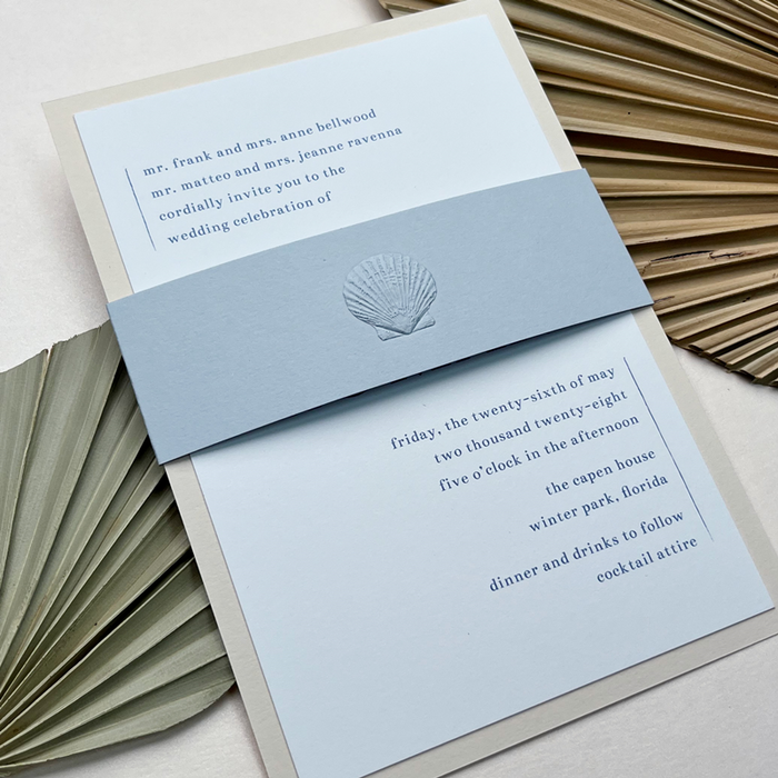 Invitation Bellyband: 1.75" Fog Bellyband with Blind Embossing.