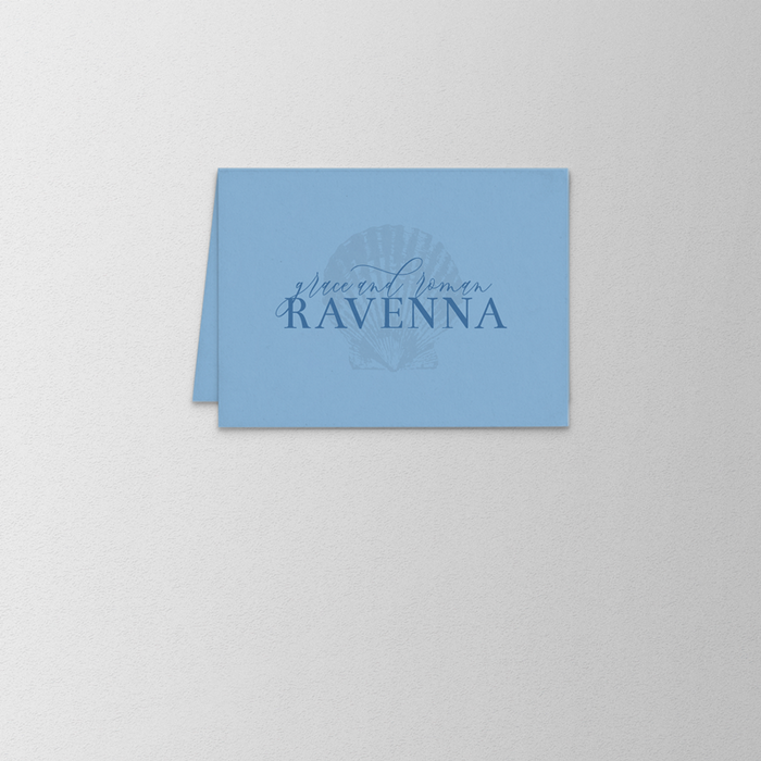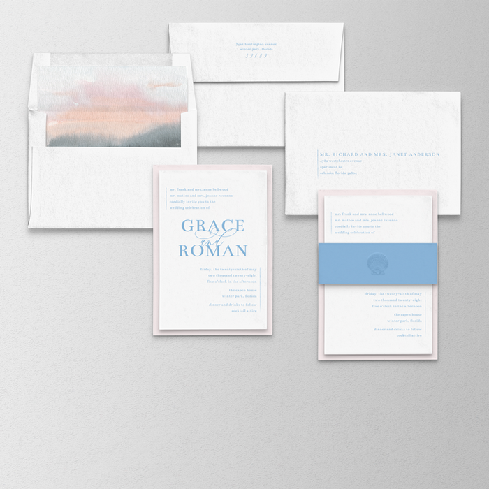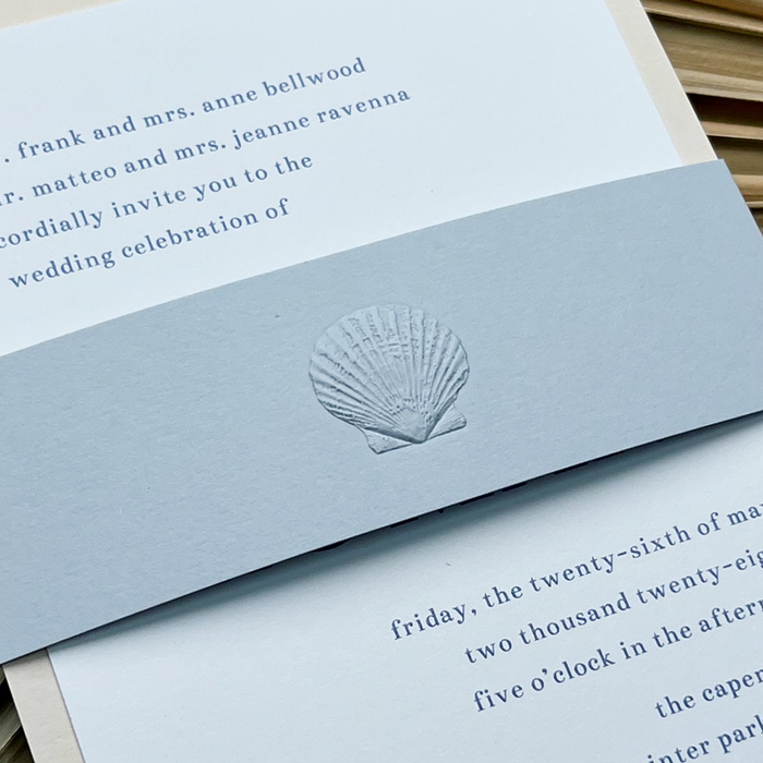 Invitation: Slate Blue Thermography Ink. Blind Embossed Bellyband.