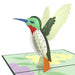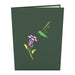 The Hummingbird pop up features a forest green cover laser-cut with a light green hummingbird hovering above a pink honeysuckle.